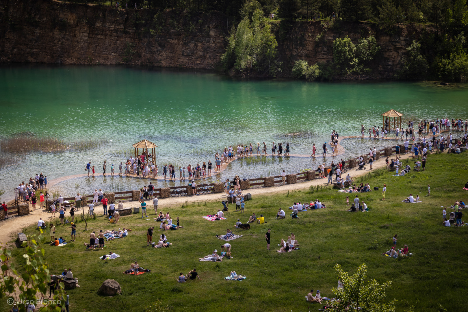 Ale trochę o miejscu. Park Gródek to tak naprawdę arboretum czyli ogród dendrologiczny. Powstał w miejscu po dawnych zakładach dolomitowych i kamieniołomie. Nie będę tutaj zamieszczał historii tego miejsca bo nie ma to sensu. To co jest ważne to fakt, że powstało naprawdę ładne miejsce. Są jeziora czy raczej zalewy, ale chyba najbezpieczniej napisać zbiorniki wodne z krystalicznie czystą lazurową wodą. Widoczność sięga kilku metrów. Są strome klify. Są ścieżki dydaktyczne, zarówno szczytami klifów jak i dnem wyrobiska. jest baza nurkowa. Ale jest też bardzo ciekawa kładka poprowadzona na wodzie jednego ze zbiorników. Gdy wody jest mało, kładka znajduje się ponad wodą, jednak gdy opady były spore, można iść kładką brodząc w czystej wodzie po kostki. Gdzieniegdzie widać pozostałości po przemysłowym charakterze tego miejsca.