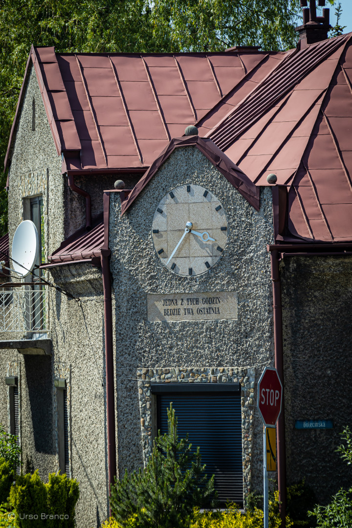 Z Jaworzna kierujemy się już powoli w stronę Krakowa. Wbijamy na autostradę A4, ale dosłownie na kilka kilometrów. Tylko tyle żeby ominąć centrum Chrzanowa. Drogą nr 781 jedziemy do miejscowości Płaza. W tych okolicach jest tyle atrakcji, nie ujętych w naszym GPX, że spokojnie wystarczy ich na kilka wycieczek w te strony. Jaskinia Maciejowa, Piec wapienniczy typu Hoffmannm Muzeum Życia Codziennego 193-1979, Kamieniołom w Płazie, Pałac Starzyńskich, a wszystko to na odcinku kilku kilometrów. Nie mamy czasu nawet żeby się zatrzymać i zrobić zdjęcie, do tego w Jaworznie nam dogrzało i chcemy jechać przed siebie żeby się trochę ochłodzić. Zatrzymujemy się jednak tylko na chwilę w Płazie, żęby zrobić zdjęcie znanej chyba na całą Małopolskę, jeśli nie szerzej plebanii. Budynek zlokalizowany jest przy skrzyżowaniu, a zbliżającym się od strony południowej ukazuje się wielkim zegarem oraz jakże optymistyczną sentencją pod nim.