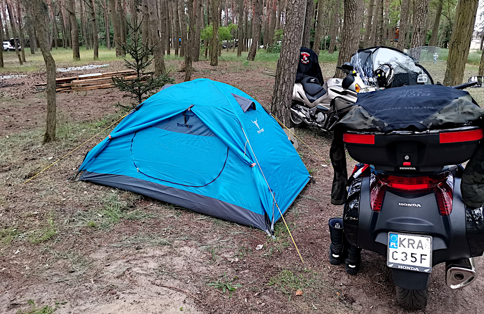 Wyjazd na Motopiknik miał być moim pierwszym wyjazdem motocyklowym pod namiot. Byłem już Devilką w Bieszczadach wraz z Motoniedźwiedziem Grześkiem oraz Magdą i Kubą, ale tam nocowaliśmy w pensjonacie i nie nastawialiśmy się na samodzielne gotowanie. Tym razem po raz pierwszy przyszło mi przemyśleć, zaplanować i spakować wszystko co potrzebne, żeby spędzić 3 dni na kempingu w lesie nad jeziorem – w miejscu, w którym nigdy nie byłem i nie do końca wiedziałem, czego się spodziewać. Do tego dochodziła kwestia pogody, która w tym roku jest wyjątkowo nieprzewidywalna. Jak dodałem do tego moją skłonność do zabierania (zbyt) wielu rzeczy, bo „a nuż się przydadzą” to wyobraziłem sobie objuczonego wielbłąda ze znaczkiem Hondy na garbie. Jak się jednak okazało, udało mi się spakować całkiem szybko i sprawnie, a do tego nie pominąłem żadnej rzeczy, której brak okazałby się bolesny.
