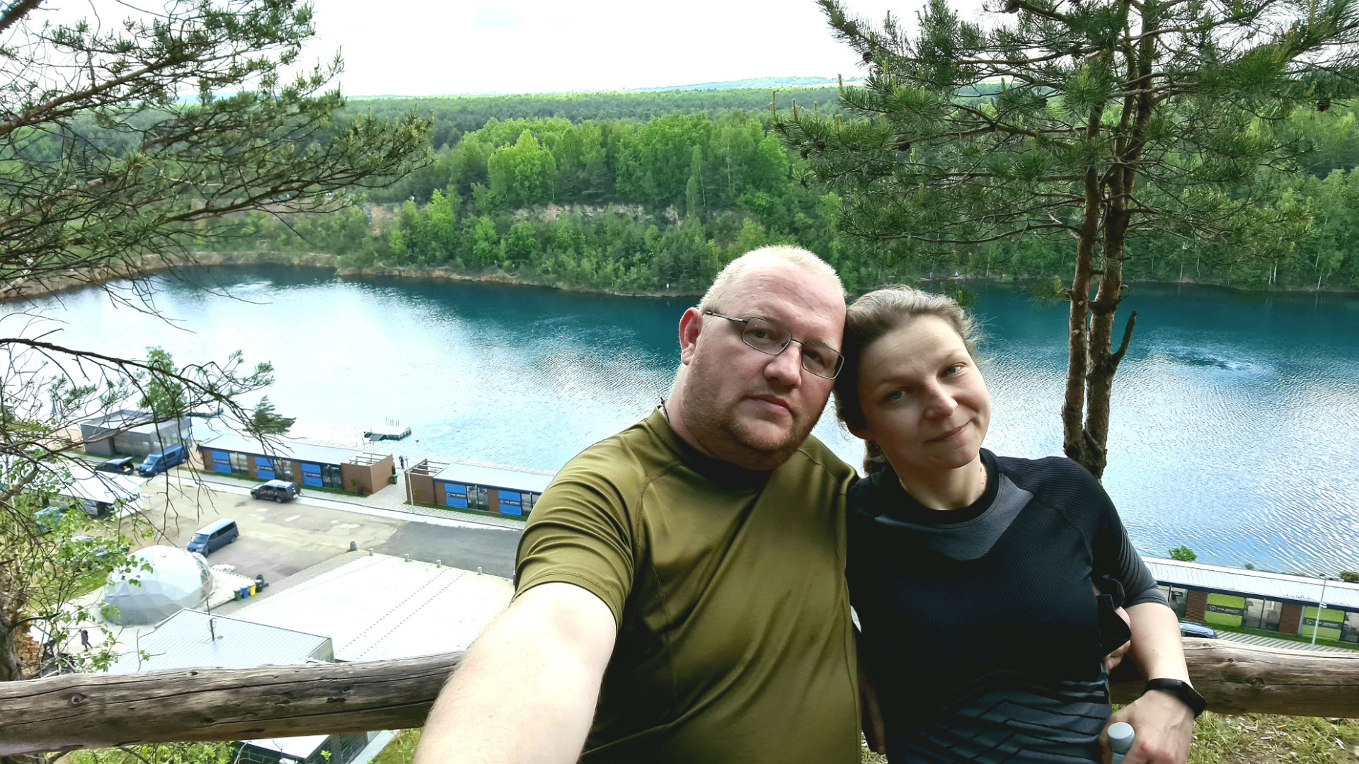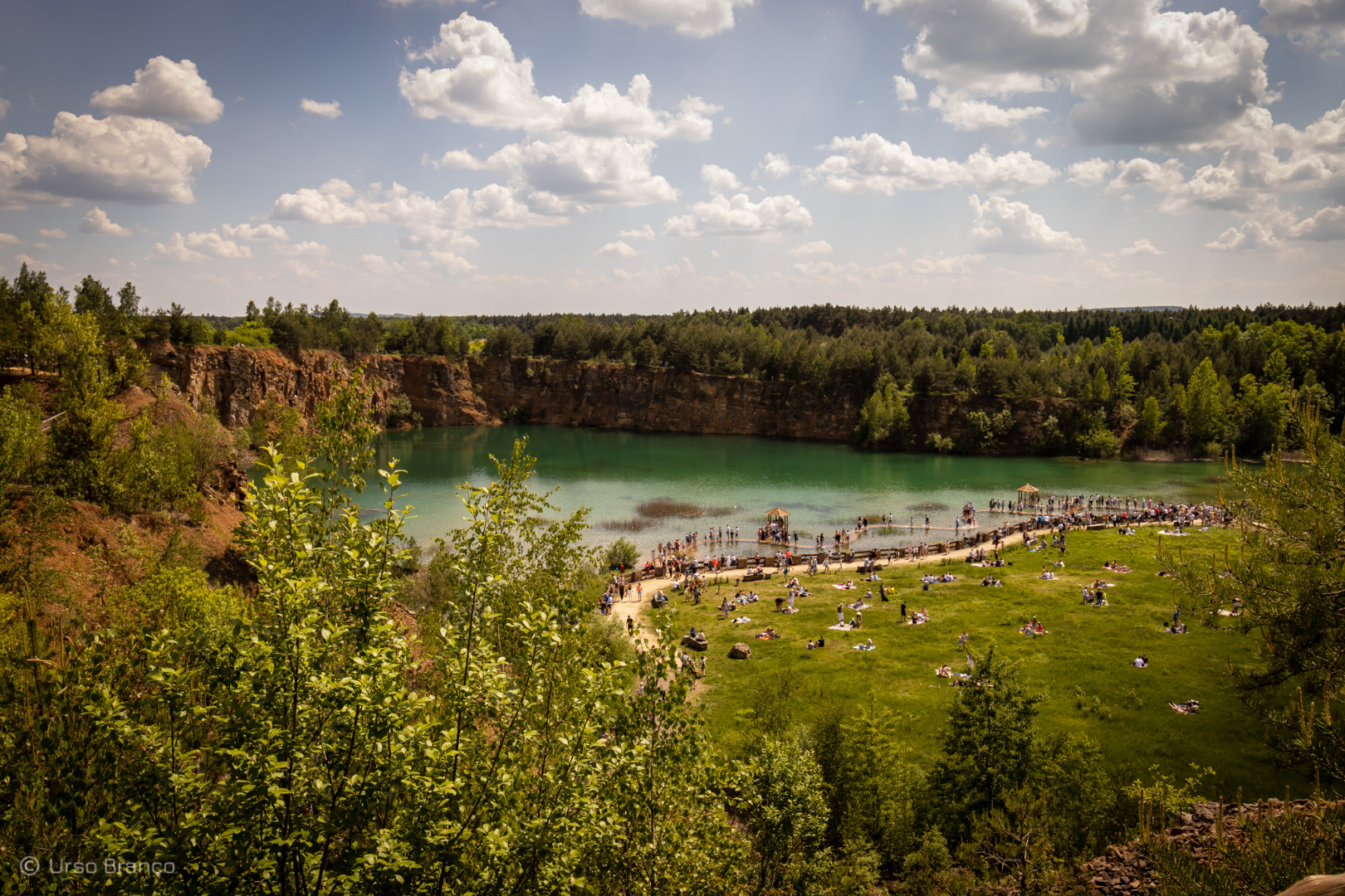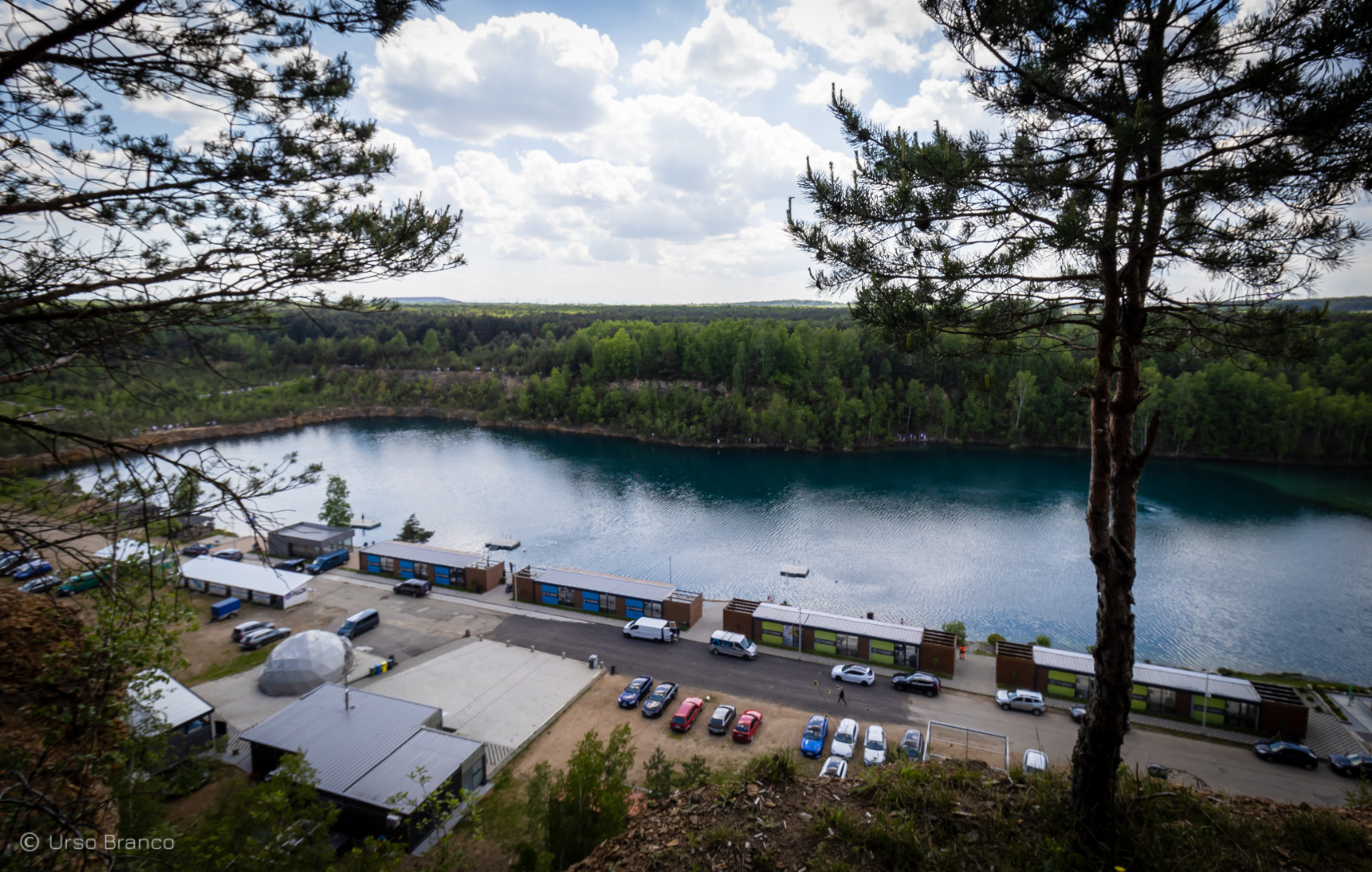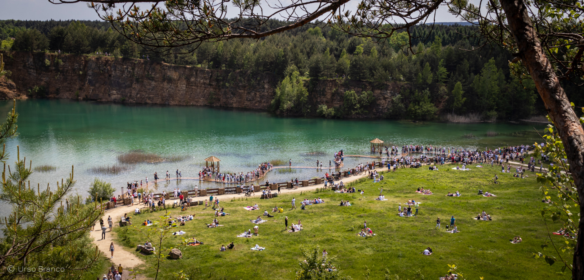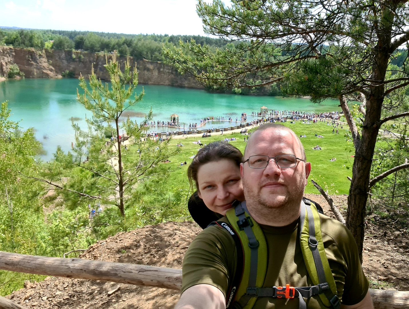 Ale trochę o miejscu. Park Gródek to tak naprawdę arboretum czyli ogród dendrologiczny. Powstał w miejscu po dawnych zakładach dolomitowych i kamieniołomie. Nie będę tutaj zamieszczał historii tego miejsca bo nie ma to sensu. To co jest ważne to fakt, że powstało naprawdę ładne miejsce. Są jeziora czy raczej zalewy, ale chyba najbezpieczniej napisać zbiorniki wodne z krystalicznie czystą lazurową wodą. Widoczność sięga kilku metrów. Są strome klify. Są ścieżki dydaktyczne, zarówno szczytami klifów jak i dnem wyrobiska. jest baza nurkowa. Ale jest też bardzo ciekawa kładka poprowadzona na wodzie jednego ze zbiorników. Gdy wody jest mało, kładka znajduje się ponad wodą, jednak gdy opady były spore, można iść kładką brodząc w czystej wodzie po kostki. Gdzieniegdzie widać pozostałości po przemysłowym charakterze tego miejsca.