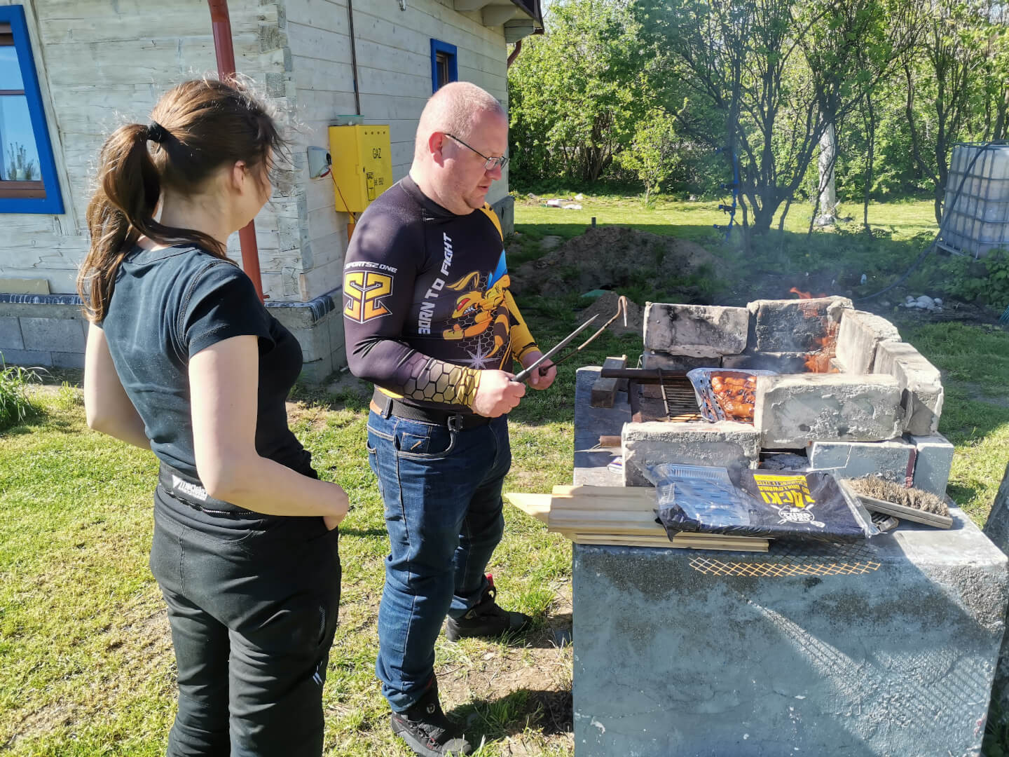 Głodni i zmęczeni docieramy do prawdziwego celu naszej podróży. Postanowiliśmy przy okazji wycieczki odwiedzić naszego przyjaciela Mateusza. Mateusz absolwent mojego kursu, w tej okolicy oddaje się dłubaninie przy swoim ranczu. Miał być szybki grill, po jednej kiełbasce i w dalszą drogę. Okazało się, że Mateusz ze swoją uroczą żoną ugościli nas po królewsku. Zostaliśmy trochę dłużej niż planowaliśmy. Po jedzeniu ociężali z pełnymi brzuchami wgramoliliśmy się jakoś na siodła i ruszyliśmy dalej. Nie wiem jak reszcie ekipy ale dla mnie ten odcinek był bardzo męczący. Na własnej skórze przekonałem się jak bardzo spada koncentracja i refleks gdy w pełnym słońcu, po sytym objedzie trzeba jechać dalej. Odliczałem kilometry do kolejnego większego postoju, mocno walcząć z coraz cięższymi powiekami.