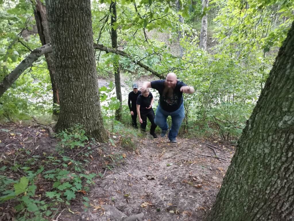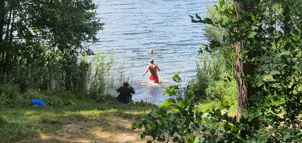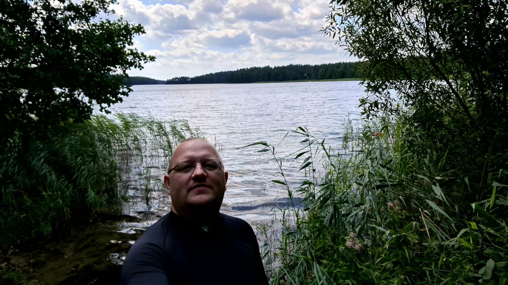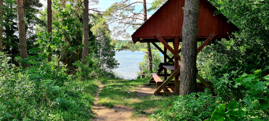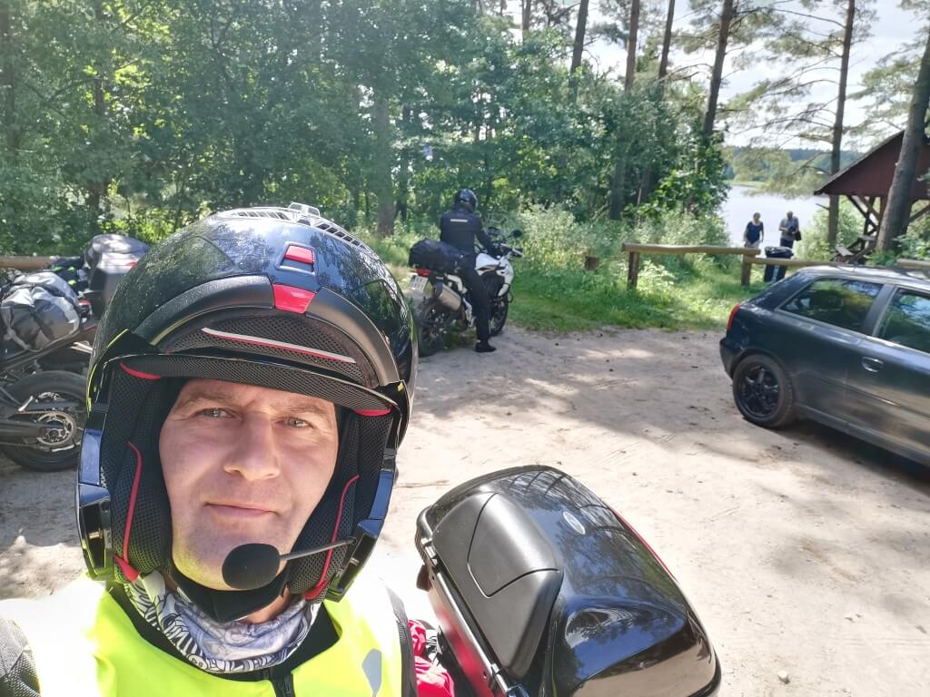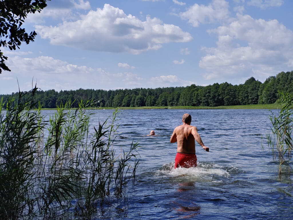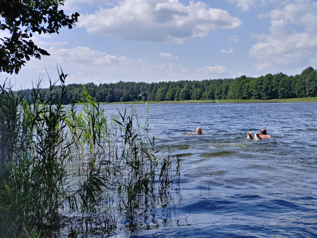 I wreszcie jest.... Nawigacja pokazuje że jezioro jest tuż obok drogi, przy drodze znak że zbliżamy się do parkingu leśnego. Tak, to jest to miejsce. Właśnie tutaj ziści się mój plan. Trafiliśmy na super miejsce. Jest parking prawie nad brzegiem jeziora, jest wiata ze stołem i ławkami, jest kawałek trawnika, no i jest wejście do jeziora. Szybkie przebranie kąpielówek i sru do wody. Jeszcze GragJak idzie w moje ślady. Reszta nie wiedzieć czemu nie che się wykąpać. Ich strata. Woda jest cieplutka. Aż nie che się wychodzić. Na zewnątrz upałów nie ma, wieje chłodny wiatr tego dnia. Dlatego pozostanie w wodzie wydaje się kuszącą opcją. Jednak trzeba wyjść. Żołądek domaga się uwagi. Drugie śniadanie w tak pięknych okolicznościach przyrody i można ruszać dalej. Ehhhh innym razem zostanę nad wodą dłużej.