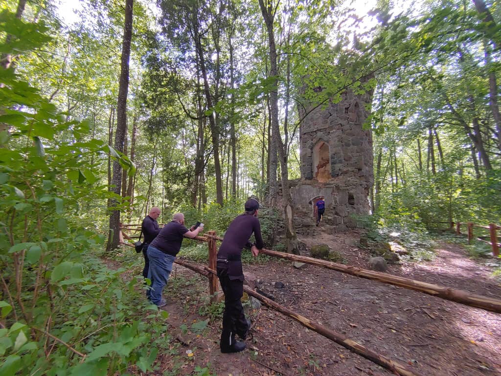 Docieramy do Giżycka, ale dzisiejsza trasa to nie jedyna atrakcja tego dnia. Mijamy miasto i kierujemy się dalej na północ i potem na zachód. Pierwsza "stacjonarna" atrakcja tego dnia to Wieża Bismarcka. Jedna z pośród 17 takich obiektów w Polsce. Siedemnastu, które zachowały się z 40 istniejących na ziemiach Polskich. Szacuje się, że na całym świecie tych budowli powstało ok 240-250. Ich celem było upamiętnienie i uhonorowanie Kanclerza Ottona von Bismarcka. Budowla w Srokowie choć ciekawa, to niestety w złym stanie. Po pierwsze aby się do niej dostać, trzeba się przygotować na mały offroad. Nie jakąś przeprawę, ale piaszczysto-kamienistą drogę. Potem jeszcze mały spacer przez las i jesteś na miejscu. Pośród drzew witają nas ruiny wieży. Ogrodzone, zakaz wstępu. Szkoda. Budowla z 1902 roku po odbudowaniu wyglądałaby okazale. Nieopodal leży kamień z jakąś inskrypcją w języku niemieckim. Nie do końca udało nam się rozszyfrować znaczenie. Gdyby ktoś wiedział co to za kamień to chętnie poznam jego historię.
