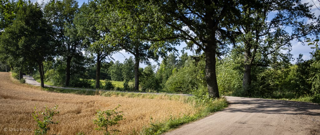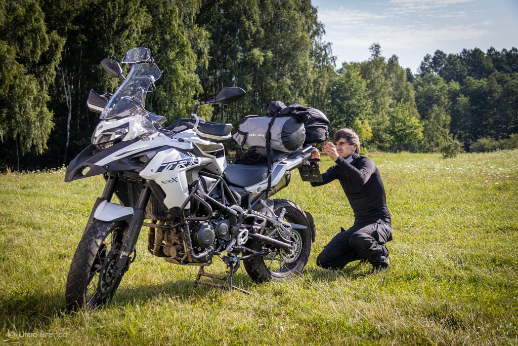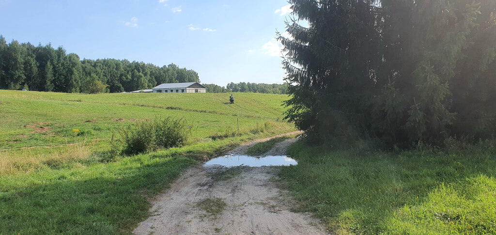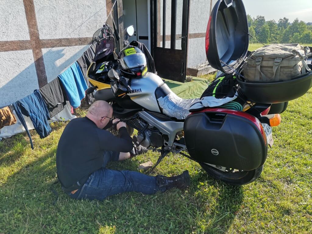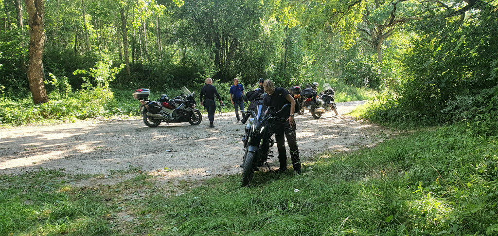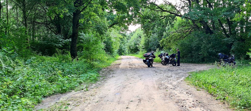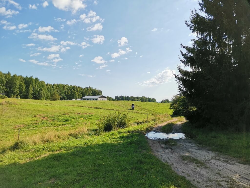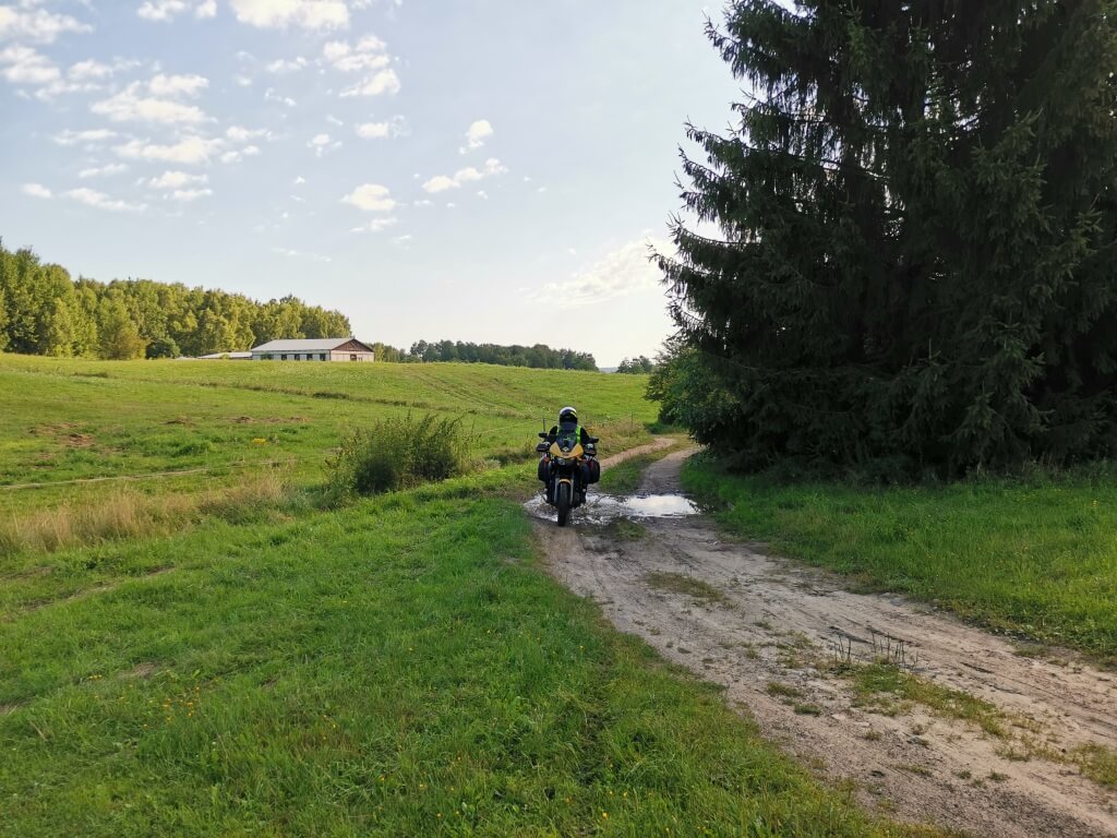 Spakowani, objuczeni, przygotowani do dalszej drogi. Jeszcze tylko trzeba sprowadzić bezpiecznie motocykle do cywilizacji. Najpierw z mokrego od rosy niewielkiego wzniesienia, później po polno-szutrowo-kamienisto-błotnej drodze. Dziś już spokojnie, bez przygód. Potem powoli ruszamy w trasę. Jeszcze szybkie tankowanie i pierwsze kilometry pokonujemy w ramach rozgrzewki bardzo niespiesznie delektując się cudownymi okolicznościami przyrody. Drogi przez pola, nie za gorąco, chłodno wręcz. Ruch znikomy.